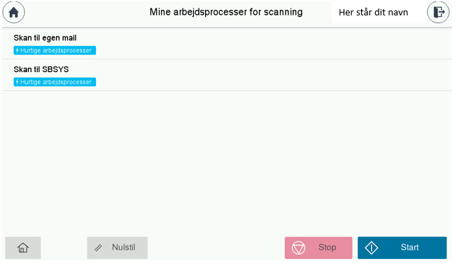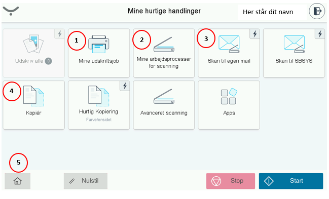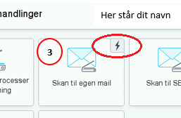 Hvis du ønsker at skanne til egen mail, så læg det ønskede papir i printeren og klik på knappen ”Skan til egen mail”. Lynet i venstre hjørne af knappen betyder at så snart du klikker på denne mail startes jobbet.