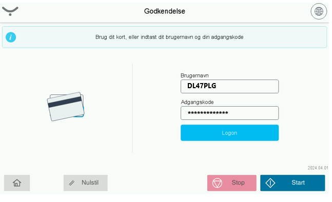 Skan dit adgangskort på printeren og log ind med dit brugernavn og samme adgangskode, som du bruger til din PC. Afslut med at klikke Logon.