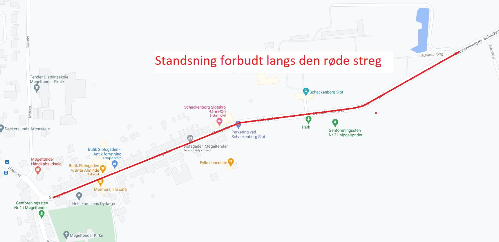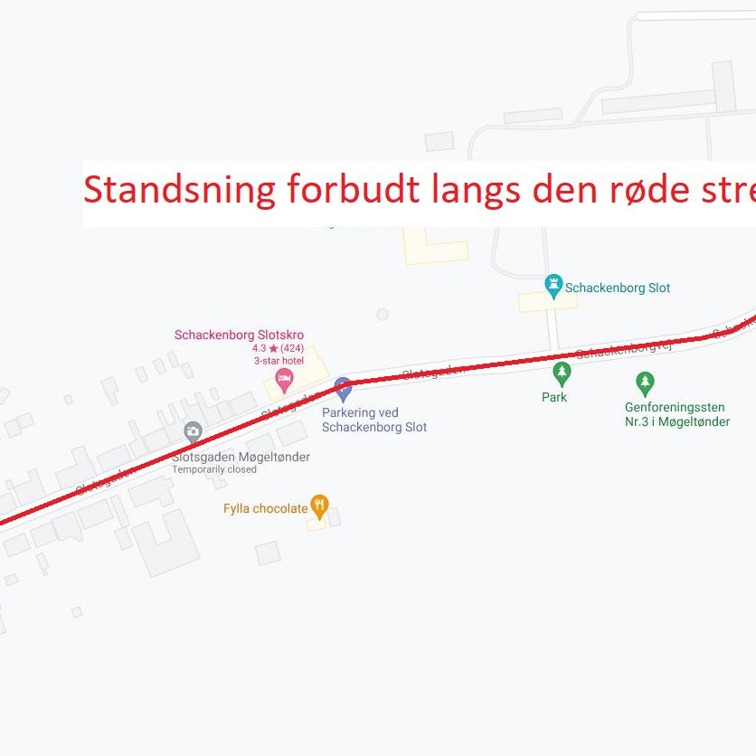 I Møgeltønder bliver der onsdag den 11. august fra 12 til 16 standsning forbudt i Slotsgaden. Det betyder, at der hverken må standes eller parkeres i det tidsrum.