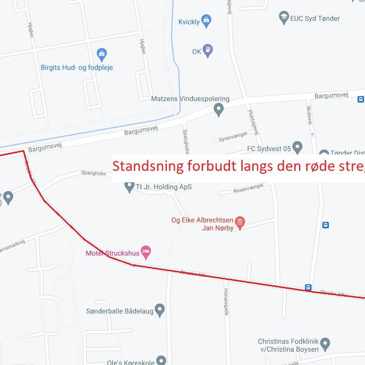 På Bargumsvej er der standsnings forbudt på den korte strækning fra omfartsvejen til der, hvor man kan dreje ind til Strucksallé.
