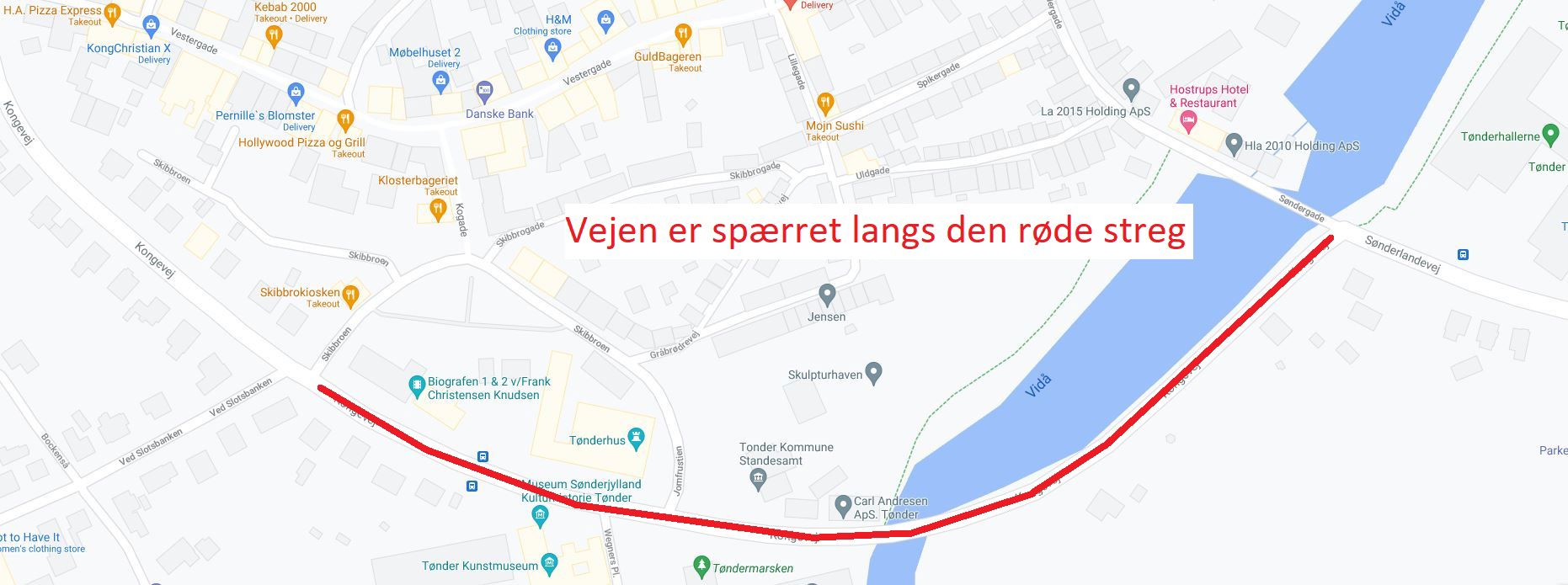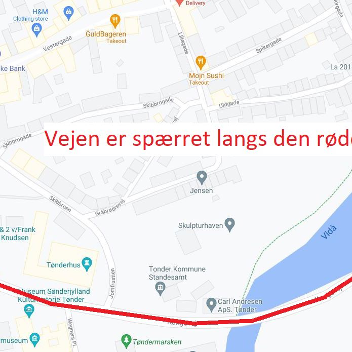 Sidst - men ikke mindst - bliver en del af Kongevej spærret torsdag den 12. august. Her bliver der spærret for al trafik fra Ved Slotsbanken til Søndergade fra kl. 7 til kl. 14.