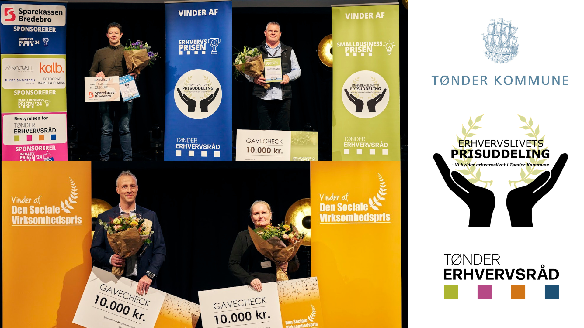 De stolte vindere fra Erhvervslivets Prisuddeling 2024. Arrangementet, som har været en årlig tradition siden 2017, bringer fællesskabet og glæden ved de lokale erhvervsdrivendes indsats i centrum. Fotocollage: Tønder Kommune